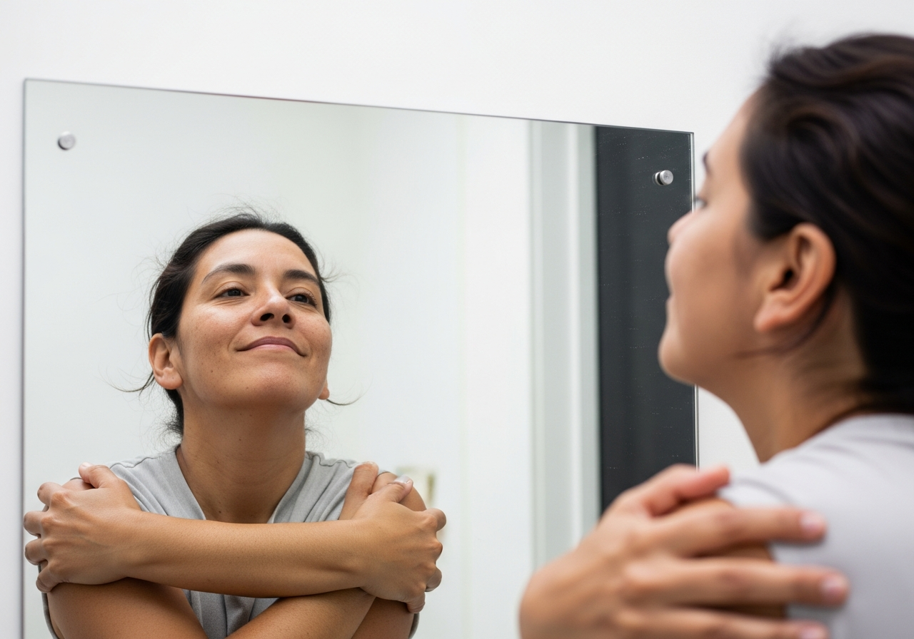 A self-hug involves wrapping your arms around yourself for about 10 seconds while standing in front of a mirror. This practice is often combined with repeating a compassionate phrase to enhance self-connection and kindness.